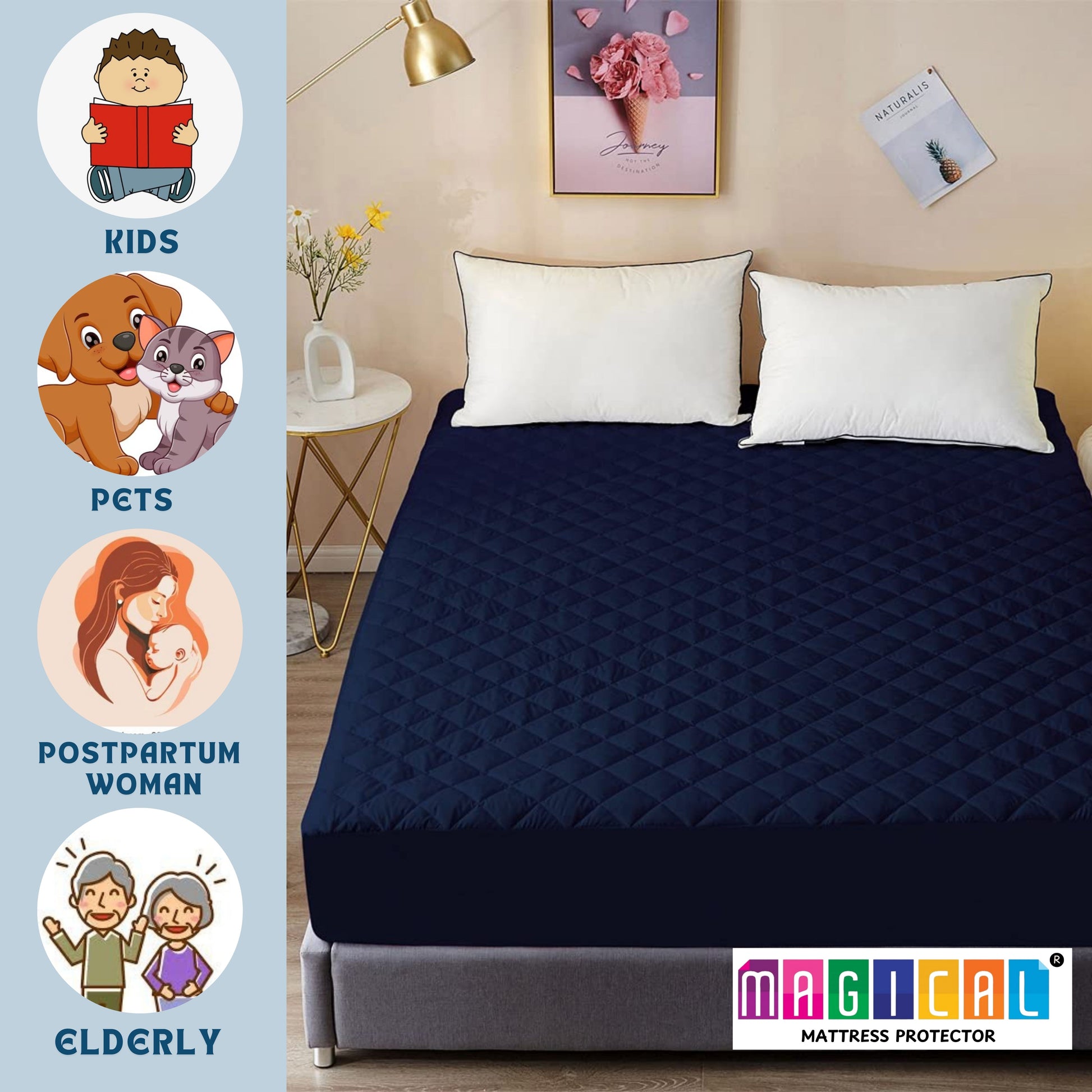 Experience the magic of a perfectly protected and comfortable sleep with the Magical Mattress Protector. This premium protector is your ultimate defense against unexpected spills, stains, and accidents.Say goodbye to worries about spills, sweat, urine, menstrual fluids, and pet accidents. Our advanced waterproof technology creates a reliable barrier, keeping your valuable mattress dry, clean, and free from stains.Designed with your comfort in mind, the Magical Mattress Protector is crafted with breathable and soft materials that feel luxurious against your skin. You'll enjoy a cool and comfortable sleep throughout the night, undisturbed by any discomfort.